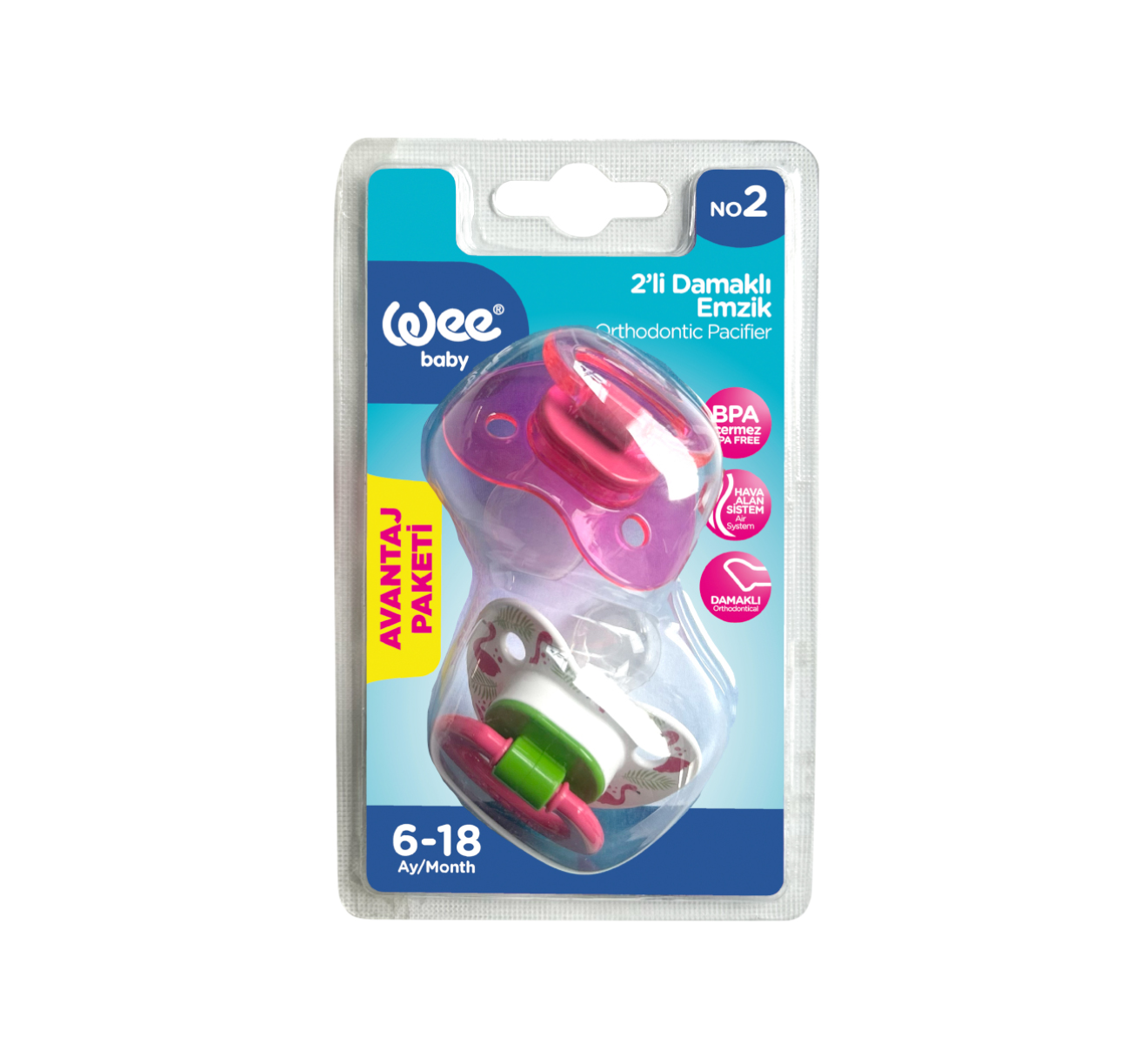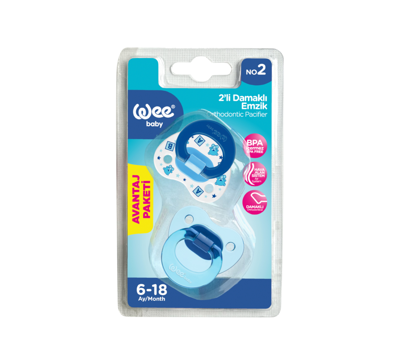 Emzikte bulunan Wee Air sistem ile emziğin içine hava girip çıkabilmekte ve bu sayede emzik ucu yumuşak kalıp şeklini korumaktadır. Bebeğin emme hareketine uyum sağlar damağın ve dişlerin doğal gelişimini destekler. Emzik kalkan bölümünde bebeğin ağız çevresinin tahriş olmaması için hava alabilen açıklıklar yer almaktadır. Bu sayede bebeğiniz emme ihtiyacını en doğal yoldan karşılayacaktır.