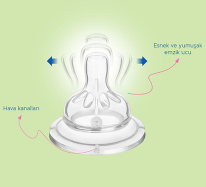 Geniş Ağızlı Biberon emziği, bebeklerin anne memesini kavradığı gibi kavrayabilmesini sağlayan yumuşak ve esnek bir yapıya sahiptir. Anti-kolik valf sistemi, beslenme sırasında dışarıdan hava yutmayı engeller.